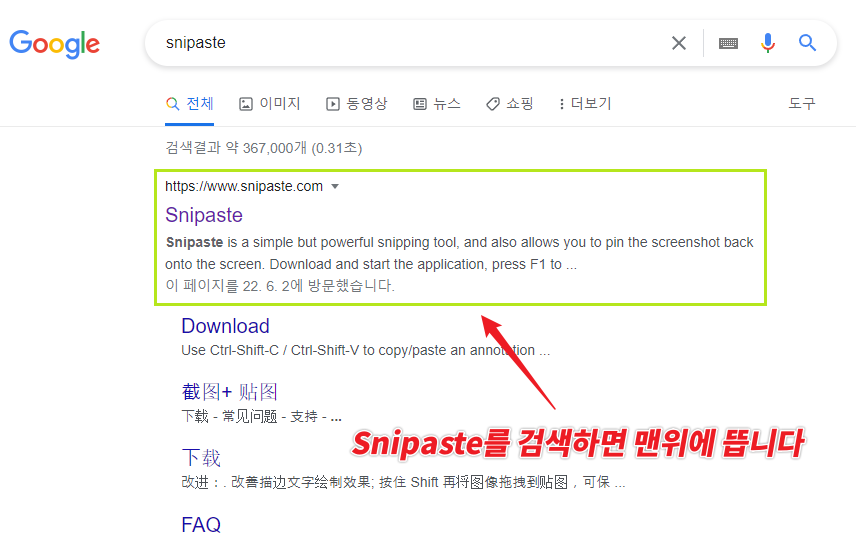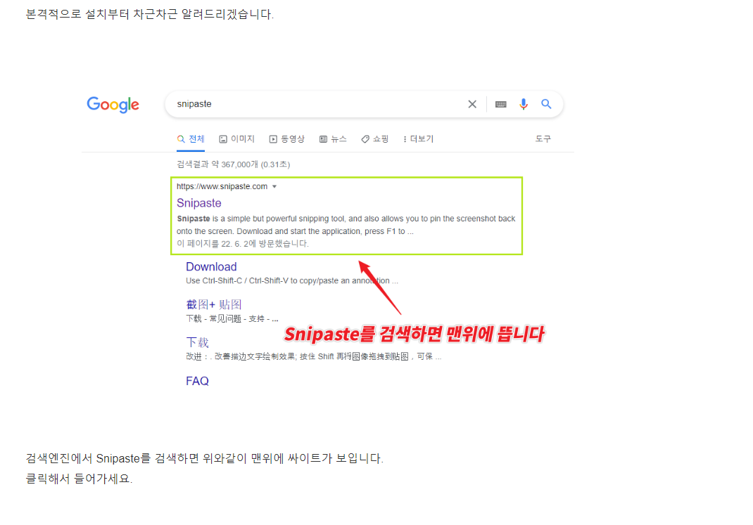 검색엔진에서 Snipaste를 검색하면 위와같이 맨위에 싸이트가 보입니다.