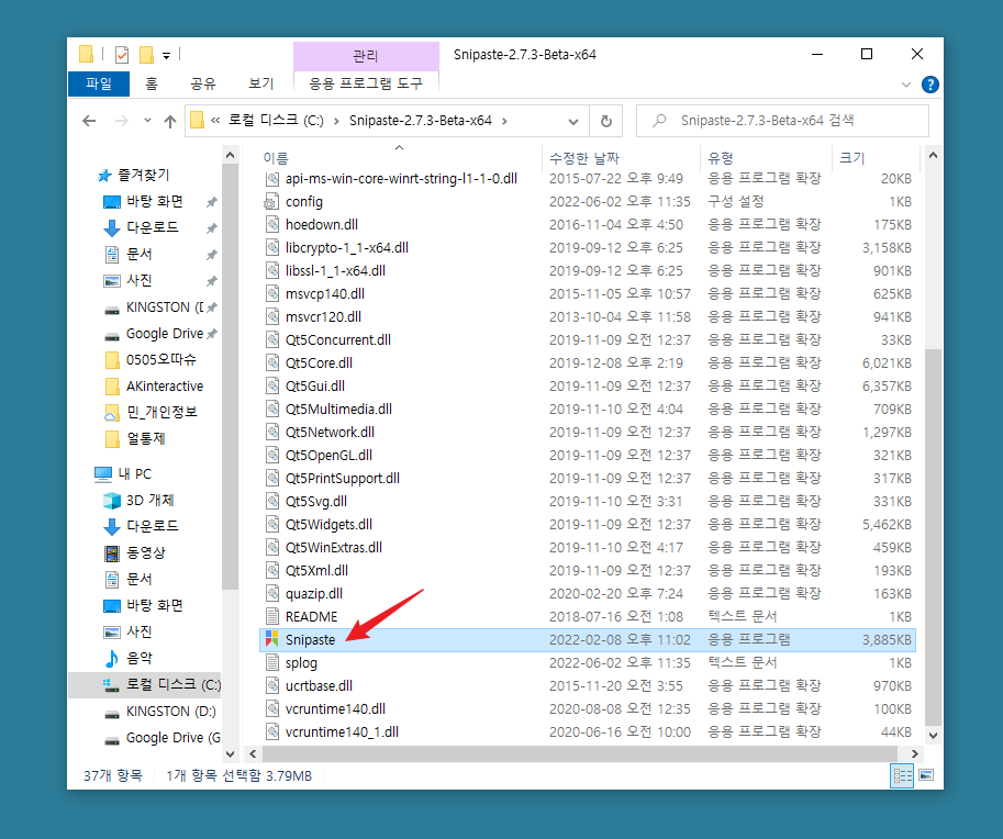 압축 푼 폴더에서 화살표 표시한 Snipaste 응용프로그램을 실행시키면 바로 실행된겁니다.