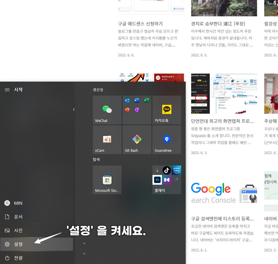 윈도우 시작버튼을 누른후 화살표가 가리키는 옛날에는 제어판이라 불렸던 톱니바퀴 모양의 설정을 누릅니다.