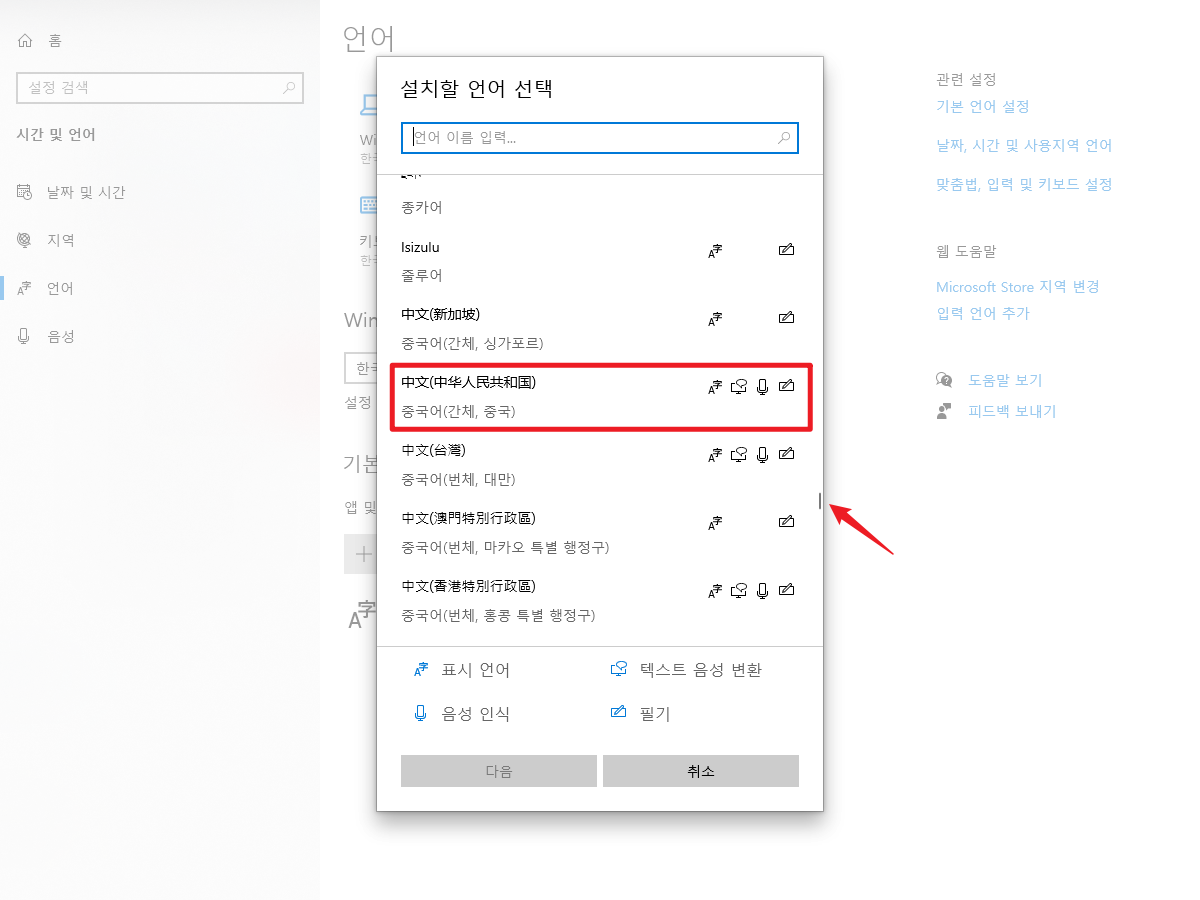 'ㅇ' 이 엄청 많으니까 마우스 휠로 고집부리지 말고 화살표 표시한 스크롤바에 커서 대면 스크롤바가 두껍게 잘 나타나거든요. 위 빨간색 네모표시한 '중국어(간체,중국) 까지 쭉 내려서 선택하고 아래 다음 버튼 클릭!