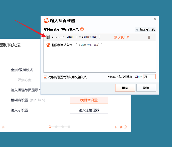 이렇게요. 한국어가 위로 올라간 상태에서 아래 确定 버튼을 클릭합니다.