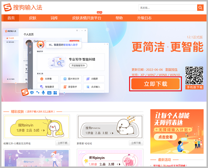 搜狗拼音输入法立即下载 更新日期 : 2022-06-06 12.1正式版 !!!!! 12.1.0.6042 !!!!! 新版特性 支持:XP / WIN7 / WIN8 / WIN10