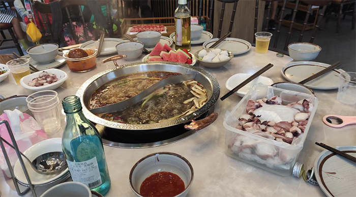 문어숙회에 훠궈랑 쏘주. 문어숙회랑 소주는 따로 사간거예요.