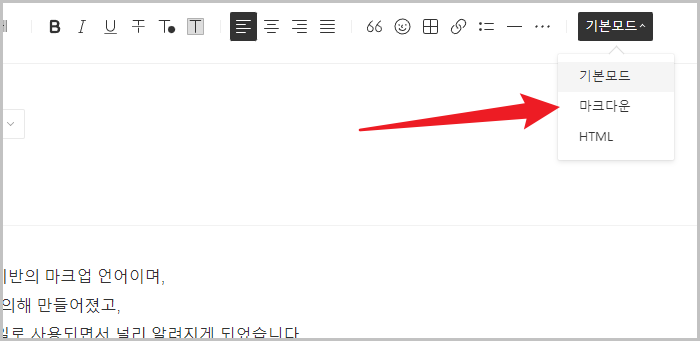 티스토리 블로그에 글쓰기 할때에도 아래 그림처럼 마크다운 이라는게 있습니다.