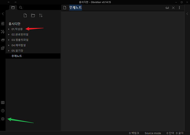 아무튼 작성중인 파일은 빨간색 화살표 표시한 작성중 폴더로 보낼건데 이것보다는 그냥 Ctrl+N 을 누르면 바로 작성중 폴더에 생성된다면 훨씬 편하겠죠.