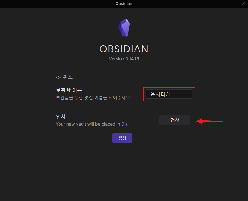 저는 이렇게 '옵시디안' 이라는 이름으로 보관함을 만들었으며 빨간색 화살표 표시한 버튼을 눌러 저장위치를 D:\ 로 해줬습니다. 이렇게 하고 아래 생성 버튼을 누르면 '옵시디안' 보관함이 생성되며 내 컴퓨터의 D드라이브에 '옵시디안' 폴더가 생겨 여기서의 작업이 로컬로 저장됩니다.