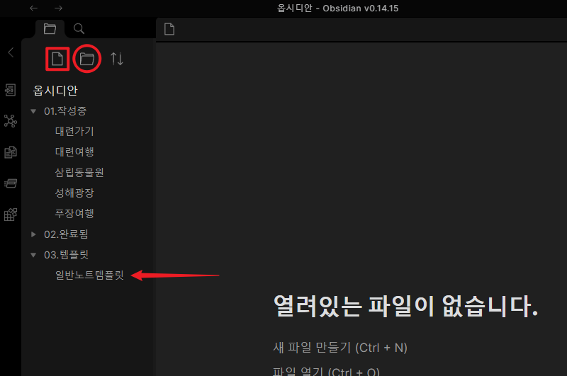 그리고 빨간색 네모표시한 새파일 만들기를 눌러 일기장 템플릿을 만들어 줍니다. (아래 이미지 참조)