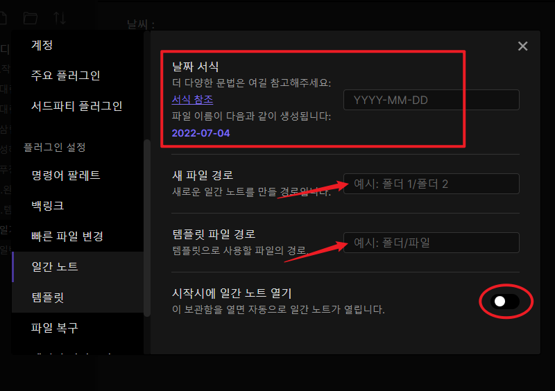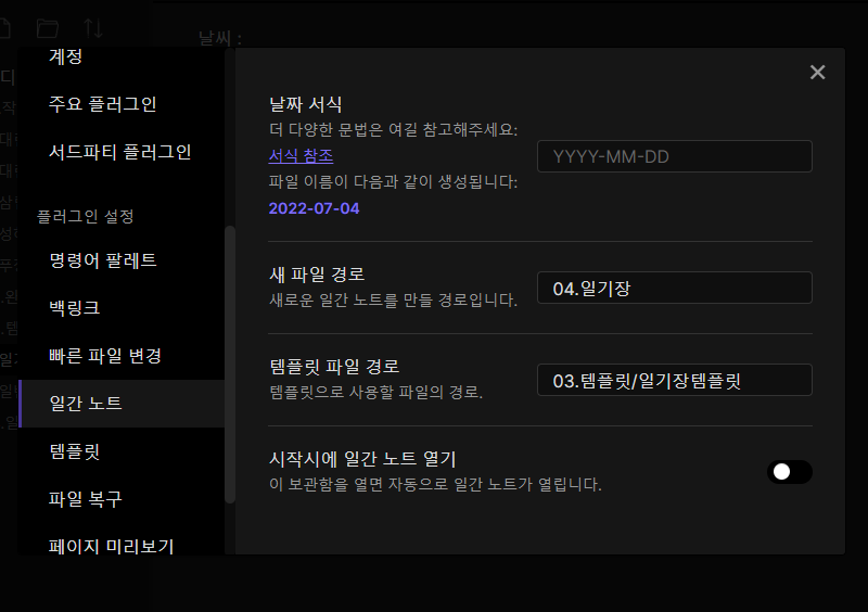 옵시디안의 '주요 플러그인' 중 '일간노트' 플러그인을 사용하여 일기쓰기 를 만들어 보겠습니다.