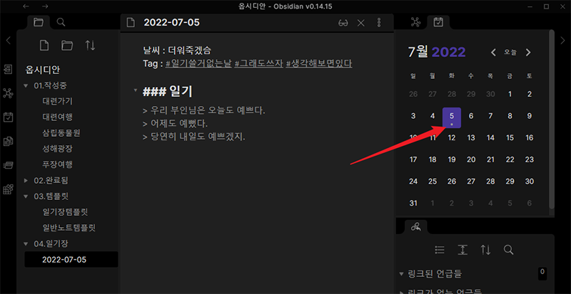 자동으로 오늘날짜의 파일명이 생성되고 04.일기장 폴더에 차곡차곡 쌓이게 됩니다.
