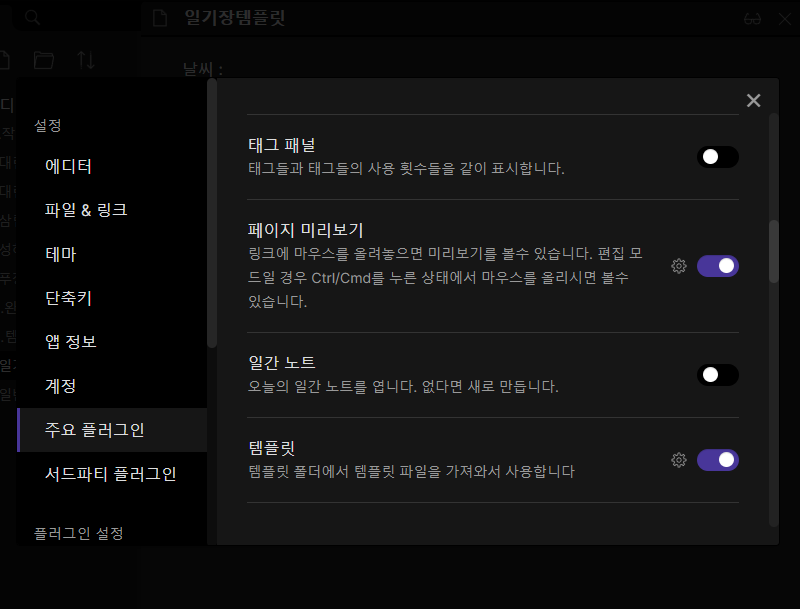 왼쪽의 '주요 플러그인' 메뉴를 클릭하고 스크롤을 쭉 내려보면 일간노트 항목이 보이고 스위치를 클릭 해 ON 시켜줍니다.