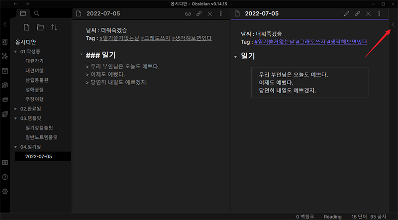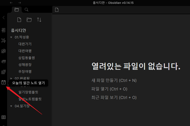 이렇게 '일간노트' 플러그인을 ON 시켰기 때문에 화살표 표시한 '오늘의 일간 노트 열기' 아이콘이 새로 생긴 것을 볼 수 있으며 클릭하면 04.일기장 폴더안에 오늘 날짜의 마크다운 파일이 생기는 겁니다. 위에 만들었던 템플릿 형식으로 말이죠.